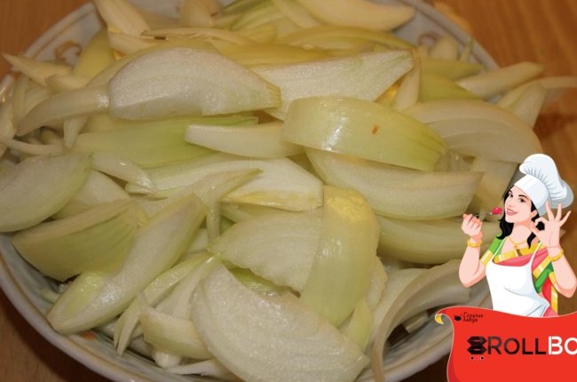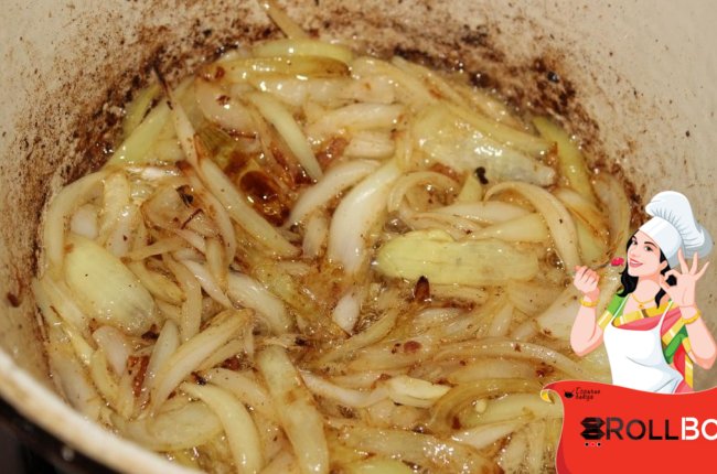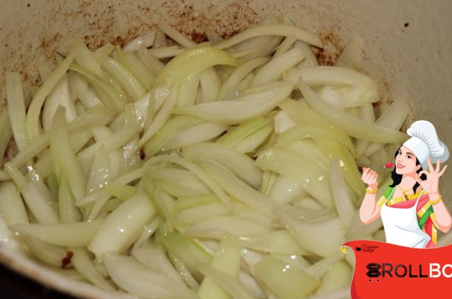Кладём лук и жарим на максимальном огне до золотистого цвета около 10-ти минут