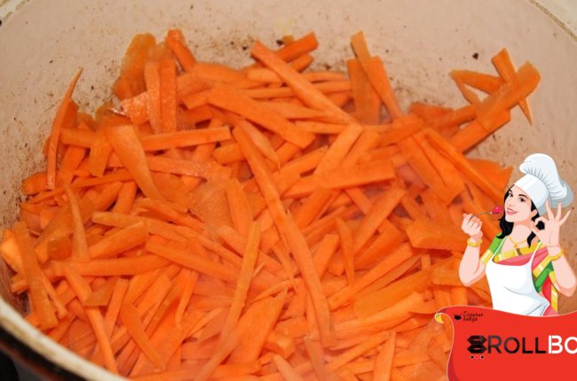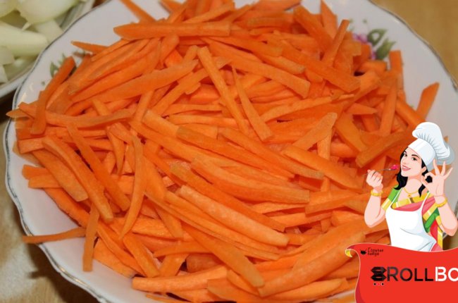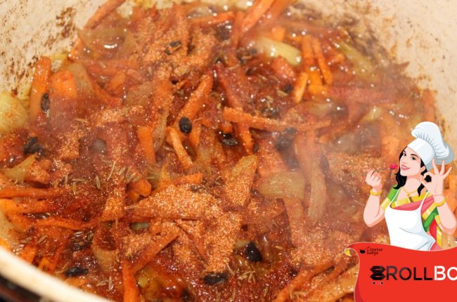 Когда морковь готова, высыпаем в неё половину наших специй и вливаем 1,5 литра холодной воды.