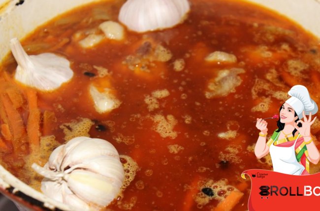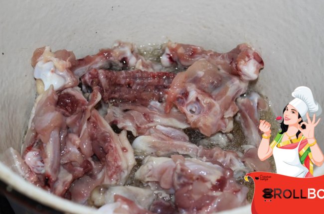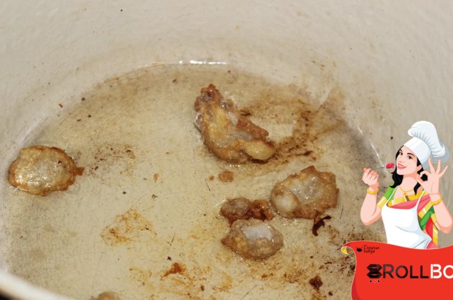 В кипящий жир кладём сначала кости и обжариваем до золотистого цвета.
