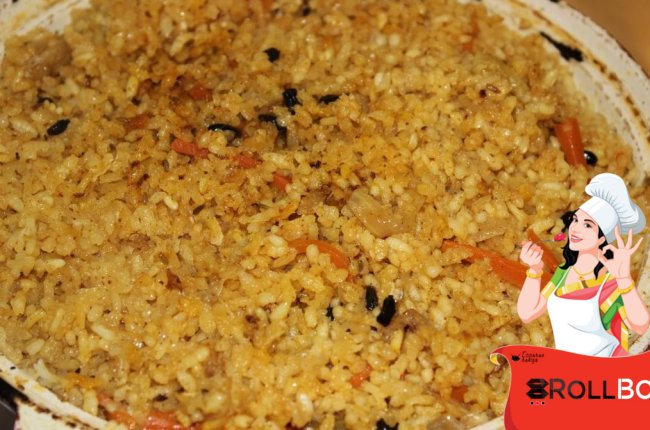 Сливаем с риса воду и выкладываем его в казан, не перемешивая с курицей. Разровняем.