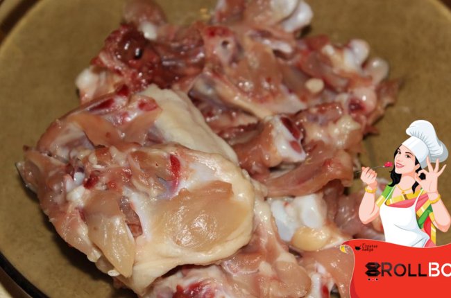 Куриные бёдра освободить от костей, кости и жир оставить. Мясо нарезать на куски.