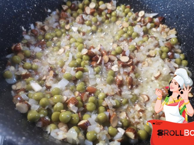 Добавляем рубленый жареный миндаль. Прогреваем... Кладем горошек... Я положила консервированный.