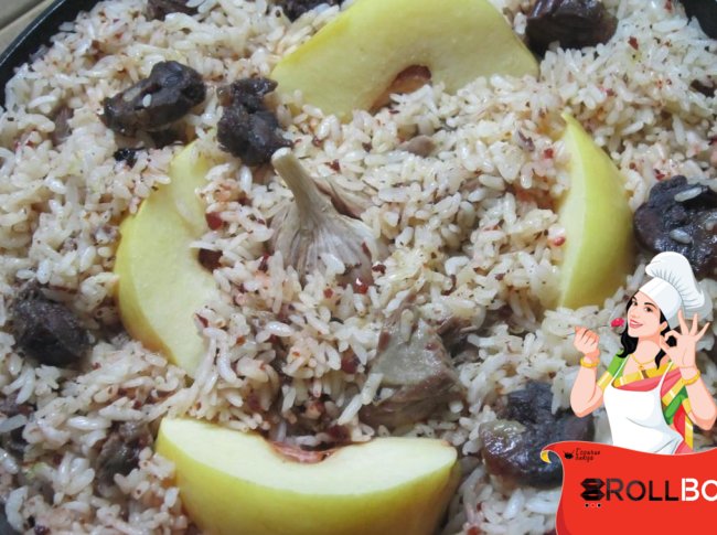 В кипящий жир кладем мясо и обжариваем его. Когда мясо обжарили, убираем его и кладем лук, потом морковь. Обжариваем, немного солим. мясо можно нарезать помельче. Огонь уменьшаем и добавляем мясо. Еще раз промываем рис и добавляем его к мясу. Разровняем, добавляем приправы, соль. Заливаем кипятком. Делаю это с помощью ложки с дырками, чтобы вода не размывала рис. Накрываем крышкой и готовим до готовности риса. Головку чеснока хорошо моем. снимаем верхний слой шелухи и втыкаем в середину плова. Колбасу нарезаем толстыми кусочками, айву нарезаем на четвертинки и убираем семечки. Когда рис будет почти готов, кладем колбасу и айву в плов. Готовый плов снимаем с огня и даем немного настояться. При подаче айву нарезаем небольшими кусочками.