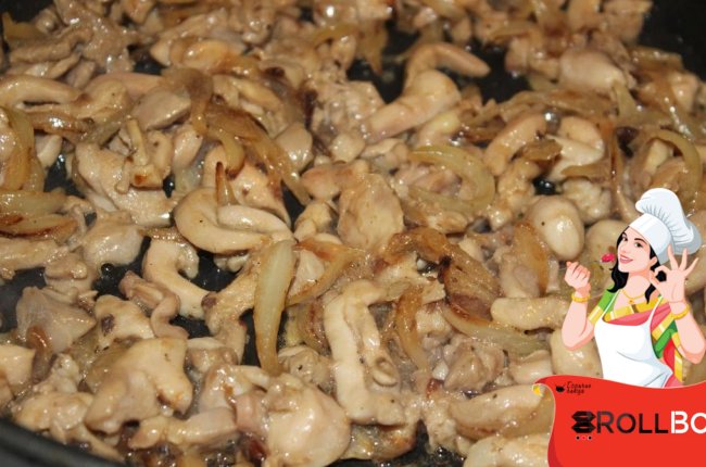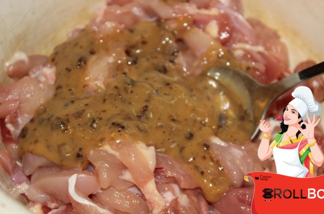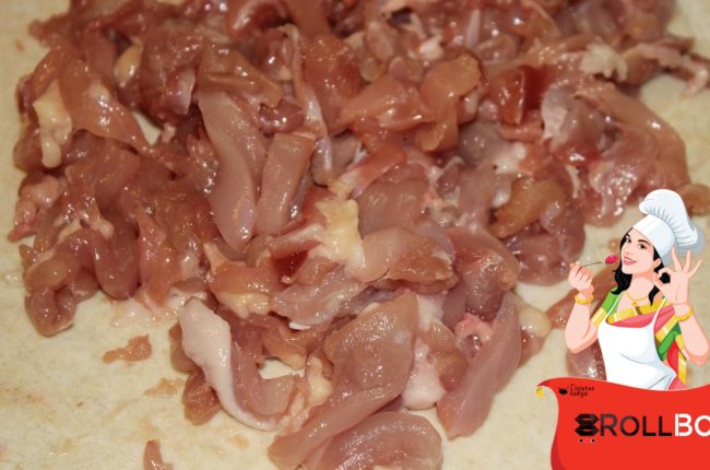 Куриное филе нарезать полосочками. Замариновать в 50 г соуса на 30 минут.