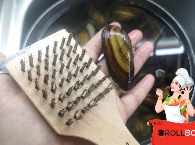 Затем надо хорошенько очистить раковины от грязи... Это можно сделать либо ножом, либо железной мочалкой, либо щеткой для чистки гриля...