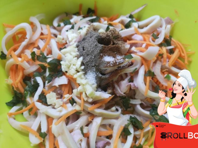 Перемешала кальмары, овощи, чеснок, кинзу... сверху горкой насыпала перец, кориандр чили и сахар...