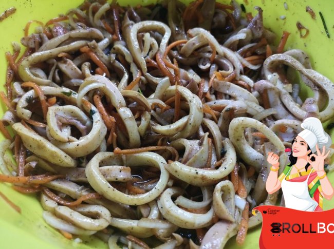 Ингредиенты кальмары - 650 гр. репчатый лук - 1 шт. морковь - 1 шт. чеснок - 3 зубчика кинза молотый кориандр - 1,5 ч.ложки молотый черный перец - 1 ч.ложка молотый чили - 0,5 ч.ложки сахарный песок - 0,5 ч.ложки соль - 0,5 ч.ложки соевый соус - 3 ст.ложки растительное масло - 100 гр. уксус 9% - 2