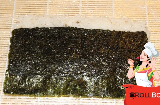 Берём небольшое количество риса и укладываем его на лист норри. Утрамбовываем не сильно нажимая на рис, чтобы он не деформировался.