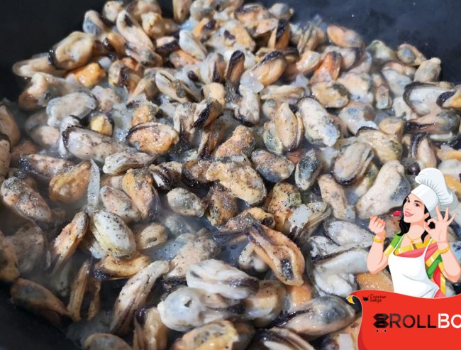 Ингредиенты замороженные мидии - 500 гр. репчатый лук - 1 шт. чеснок - 2 зубчика соль, молотый черный перец по вкусу мука - 1 ст.ложка жирная сметана (не менее 20%) - 3 ст.ложки кипяток - 100 мл Приготовление На разогретом растительном масле обжариваем мелко нарезанный репчатый лук. Потом кладем