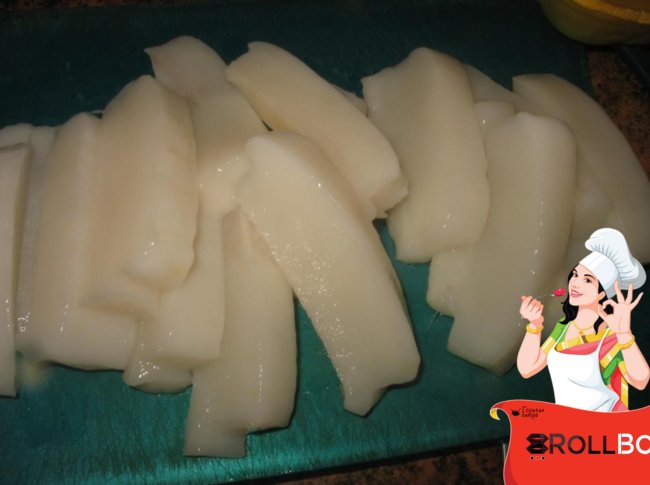 Свежемороженый кальмар размораживаю не до конца, снимаю (стягиваю при помощи ножа) пленки, нарезаю соломкой.