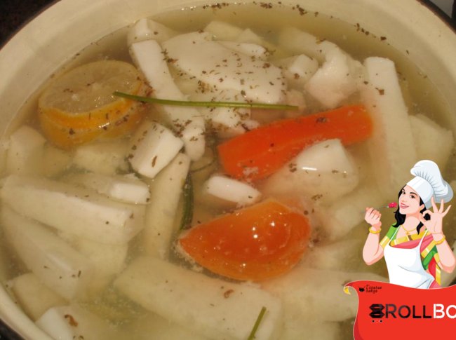 Кипячу маринад: в подсоленную воду выдавливаю четвертинку лимона и выдавленный кусочек тоже бросаю в кастрюлю, добавляю лук, морковь, пряности, довожу до кипения, опускаю соломку кальмара,