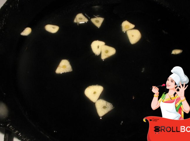 В растительном масле пожарила два зубочка чеснока, нарезанных пластинками