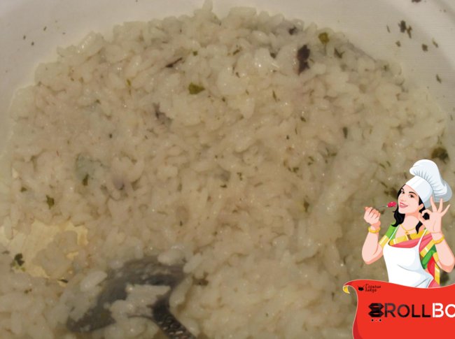 У кальмару рис с пряностями, зеленью и сливочным маслом