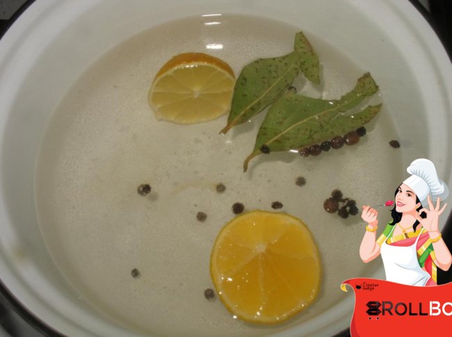 Кипятим в кастрюльке с подсоленной водой пару кусочков лимона с кожурой и пару горошин черного и душистого перца, гвоздичек, лавровый листик