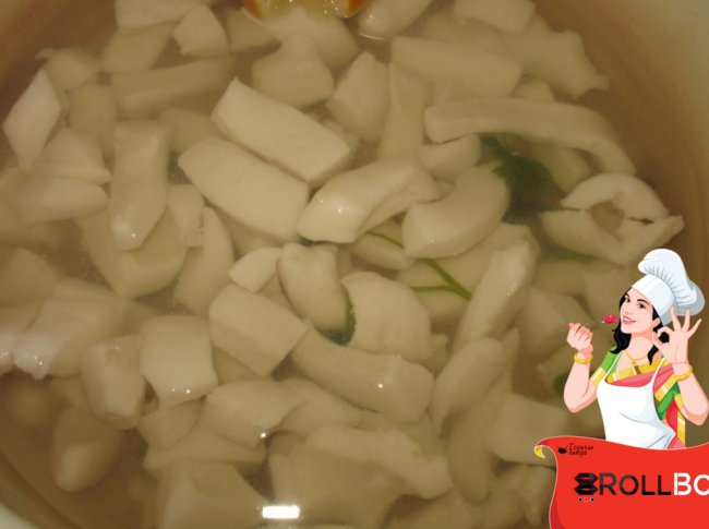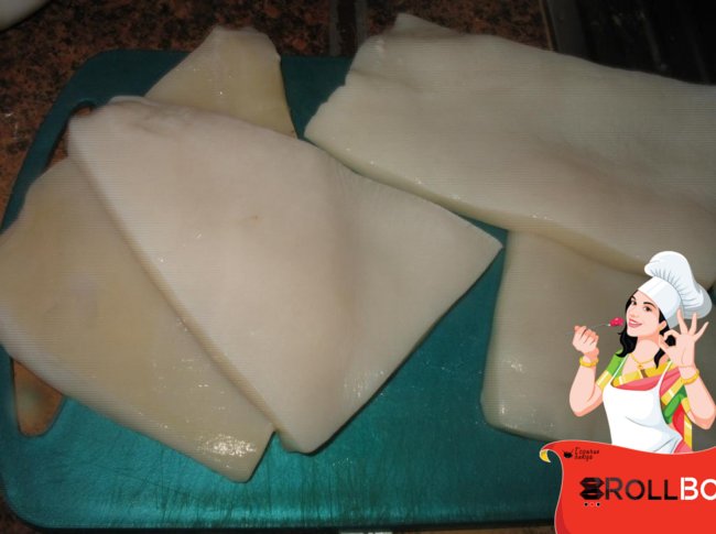 в кипящий маринад опускаем около 200 г кальмара, очищенного от пленок и порезанного полосками