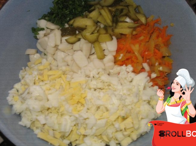 Остывший кальмар нарезаем помельче, крошим с десяток крутых яиц, зелень, маринованные огурчики и добавляем пассерованную луковицу с морковкой