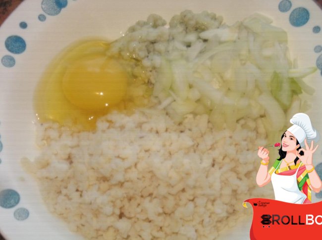 В измельченные кальмары покрошим репчатую луковицу, вобьем яйцо