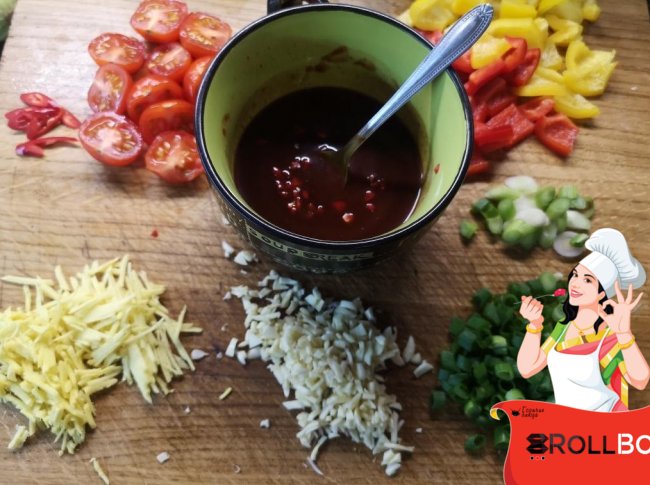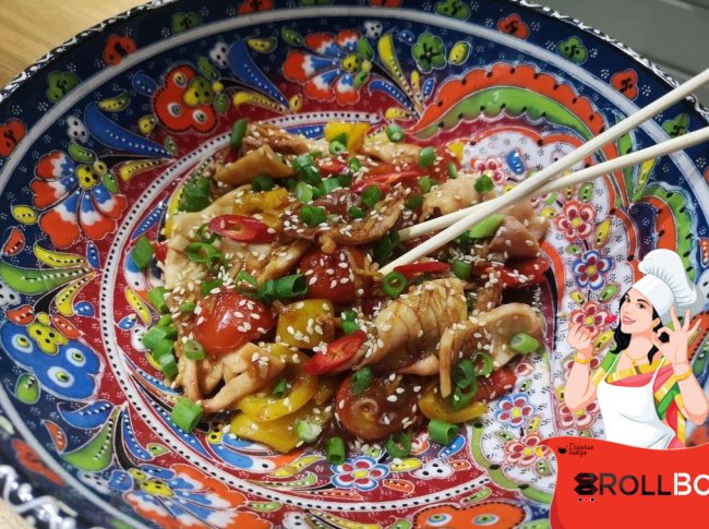 При подаче украшаем зеленым луком, колечками перца чили и обжаренным кунжутом.