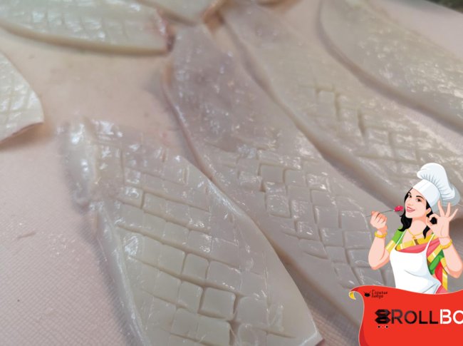 Подготавливаем кальмары. Промываем их под проточной водой, снимаем пленки, убираем все внутренности.