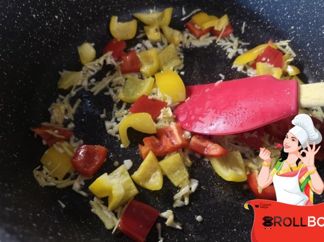 Теперь на разогретом растительном масле обжариваем секунд 30 чеснок и имбирь. Кладем туда перец. Обжариваем секунд 20.