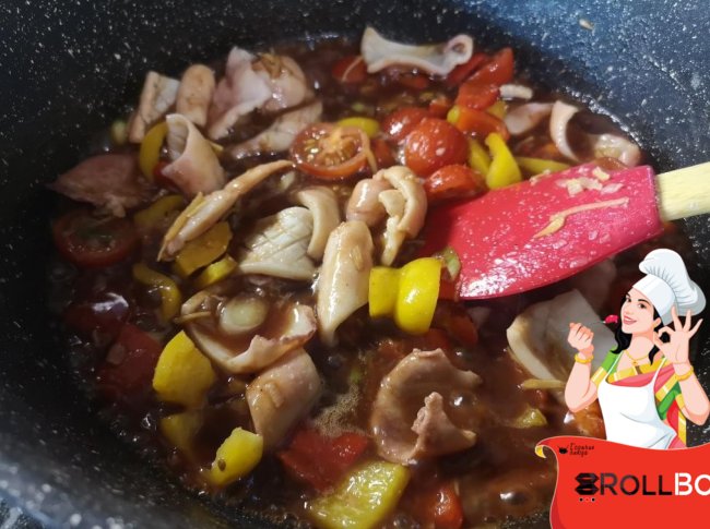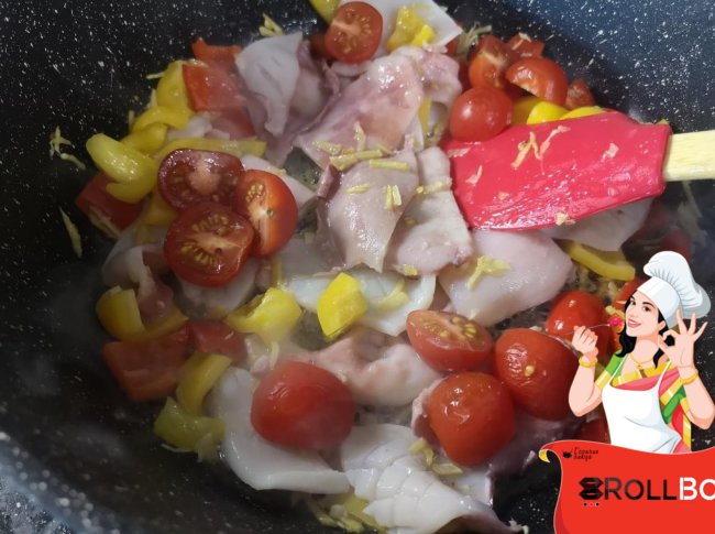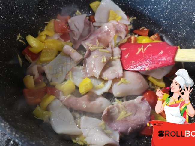 Ингредиенты кальмары - 500 гр. корень имбиря - 20 гр. чеснок - 20 гр. болгарский перец (желтый и красный) - по полштучки (100 гр.) зеленый лук - 15 гр. томаты-черри - 6-8 шт. перец чили свежий - полштучки соус Хойсин и спрайт - 100 гр. соль по вкусу обжаренный кунжут- 2 гр. Приготовление Сначала