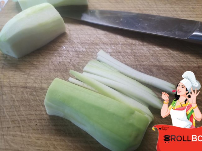 Очищаем кабачок от шкурки, нарезаем его тонкими слайсам, затем режем соломкой.
