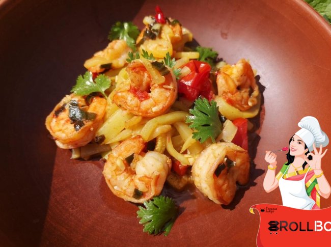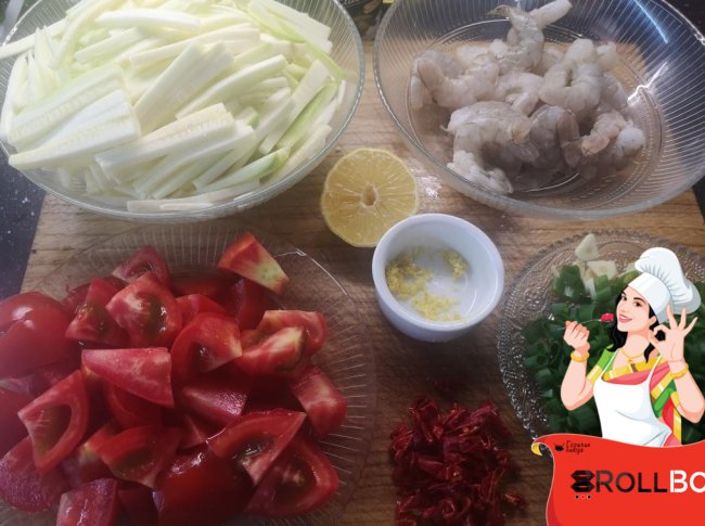 Ингредиенты кабачки - 500 гр. креветки - 500 гр. зеленый лук - пучок чеснок - 1 зубчик помидоры - 3 шт. (400 гр.) чили - 0,5-1 шт. (по желанию) сок 0,5 лимона и цедра соль, молотый черный перец по вкусу оливковое масло - 3 ст.ложки зелень кинзы Приготовление Очищаем кабачок от шкурки, нарезаем его