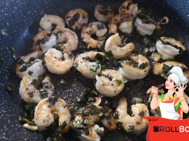 Кладем креветки, перемешиваем. Обжариваем с каждой стороны по 30 секунд. Солим, перчим.