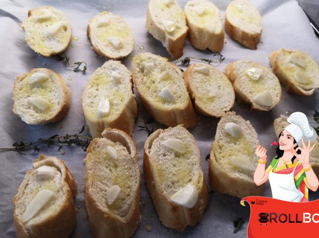 Сначала нарезаем багет кусочками толщиной в 1 см где-то. Укладываем на противень, застеленный пергаментом. Сверху сбрызгиваем оливковым маслом. Посыпаем сверху слайсами 4 зубчика чеснока. Кладем веточку тимьяна.