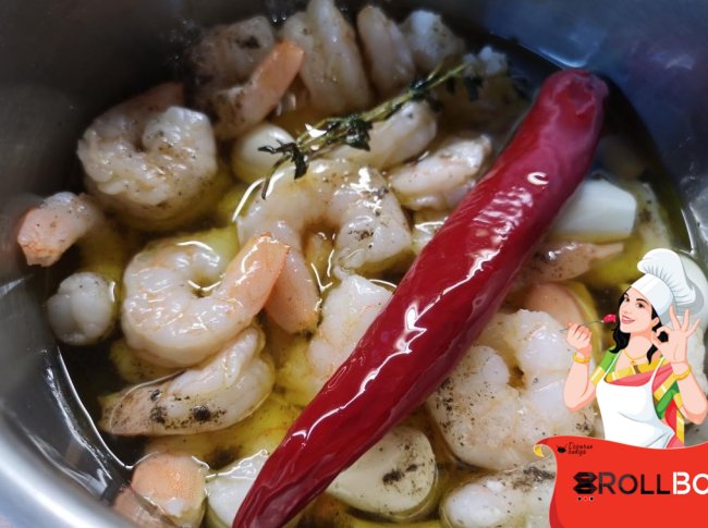 Укладываем в сотейник. Туда же оставшиеся очищенные зубчики чеснока, перчик чили, веточки тимьяна. Солим, перчим. Заливаем оливковым маслом, чтобы они почти покрыли креветки.