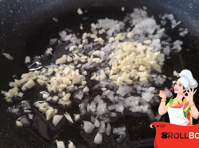 Сначала надо нарезать репчатый лук очень мелко и так же чеснок.... Положить на холодную сковороду с растительным маслом... Включить средний огонь... Обжариваем.