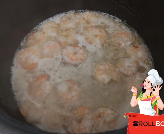 Через пару минут добавляем очищенные от панциря и кишечной вены креветки. У меня варено-мороженные королевские креветки, так что обжарила их буквально минуту... Если бы положила тигровые креветки, то жарила бы с двух сторон пока они ни порозовеют.