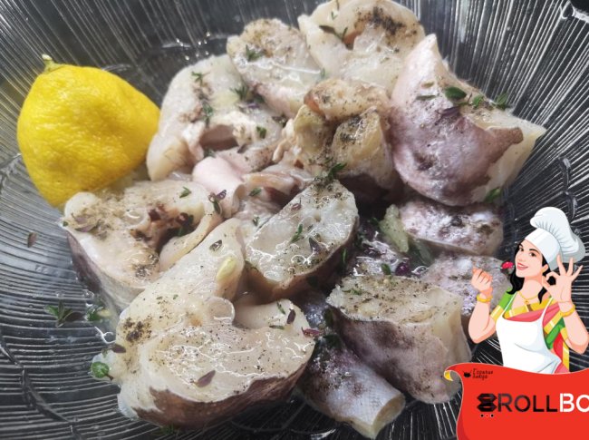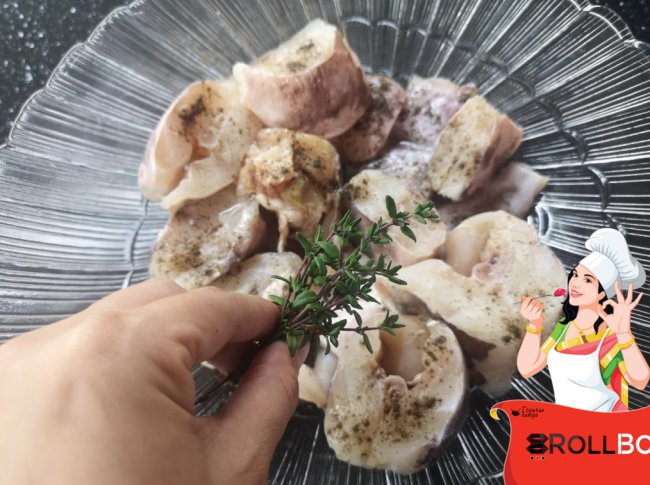 Сначала надо нарезать очищенную конгрио на куски. Посолить, поперчить. Полить лимонным соком половинки лимона. Добавить листочки тимьяна. Оставить мариноваться на полчаса.