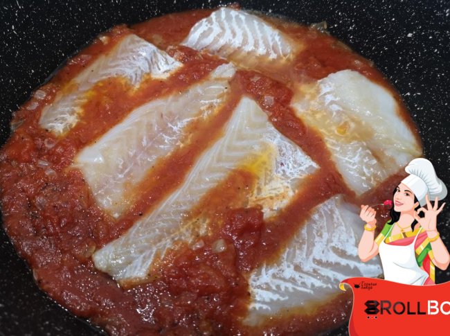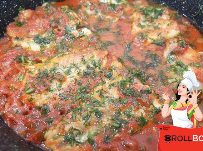 Ингредиенты филе трески - 500 гр. репчатый лук - 0,5 шт. (крупной луковицы) измельченные томаты в с/с - 500 гр. соль, молотый черный перец по вкусу зелень укропа или петрушки Приготовление Сначала надо мелко нарезать репчатый лук. Обжарить его на растительном масле до золотистого цвета. Добавляем