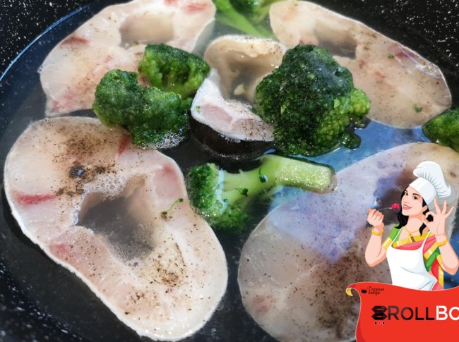 Стейки белорыбицы посолила, поперчила с обеих сторон... уложила в сковороду... залила водой так, чтобы прикрывало рыбку. Рядом положила немного брокколи (можно положить и нарезанные кабачки). Брокколи все же в следующий раз положу за 10 минут до окончания варки.