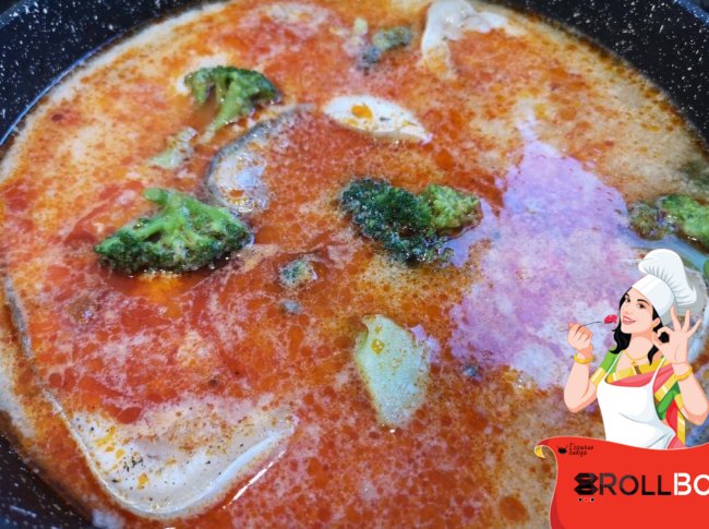Тогда я в воду добавила 2 ст.ложки пасты том ям и влила 100 мл кокосового молока. Варила все минут 20.