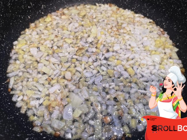 Потом туда же добавила мелко нарезанный очищенный имбирь и мелко нарезанный чеснок. Жарила, пока не почувствовала аромат чеснока.
