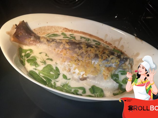 Запекала в разогретой до 180С духовке 30 минут. Потом достала, уложила по бокам в кокосовое молоко свежий шпинат и опять убрала в духовку на три минуты.