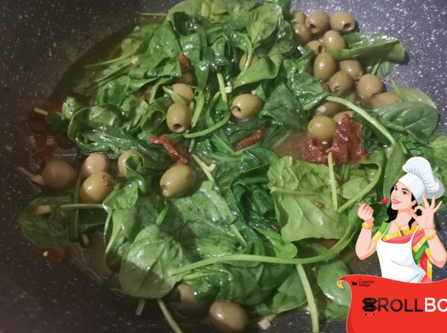 4. Добавьте томаты, оливки, шпинат, бульон, перемешайте, томите на малом огне до увядания шпината.