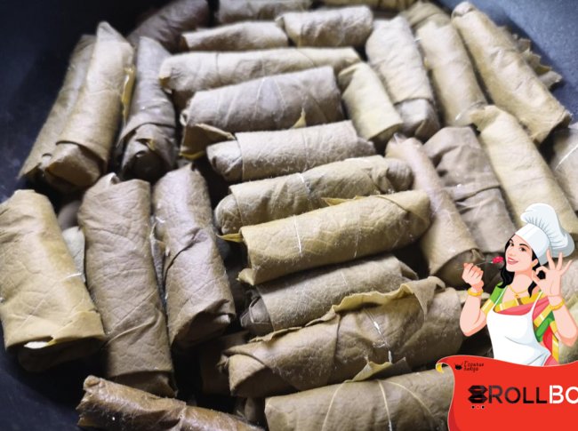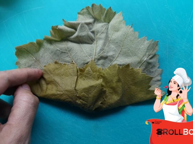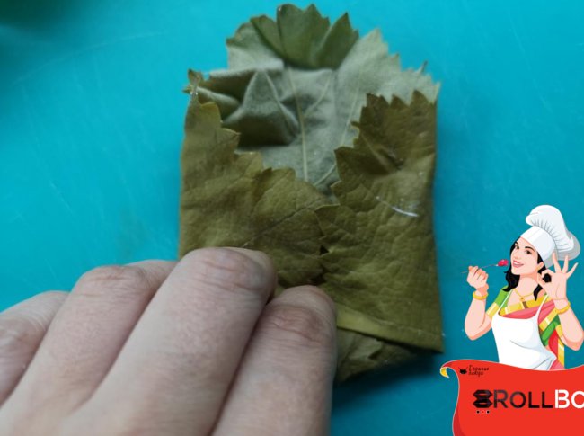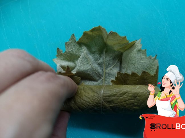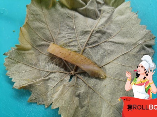 Укладываем полоску рыбки на виноградный лист (со стороны выпуклых жилок)... Заворачиваем.