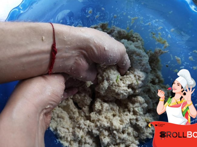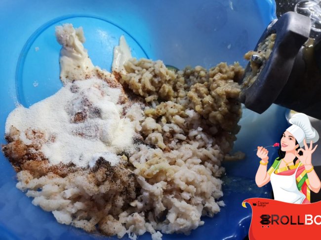 Смешиваем рыбу, овощи... приправляем... добавляем горчицу, чеснок, майонез, яйцо, манную крупу... Все перемешиваем и даем постоять минут 10.