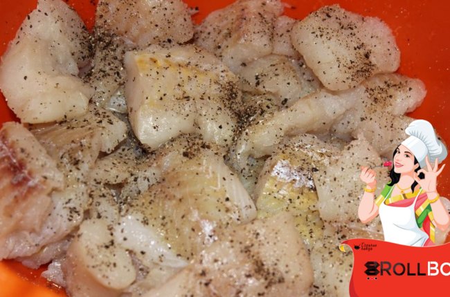 Нарезать на кусочки. Посолить, поперчить и сбрызнуть лимонным соком.