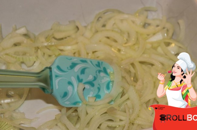 Лук нарезать полукольцами, уложить в форму для запекания. Полить растительным или оливковым маслом и перемешать.