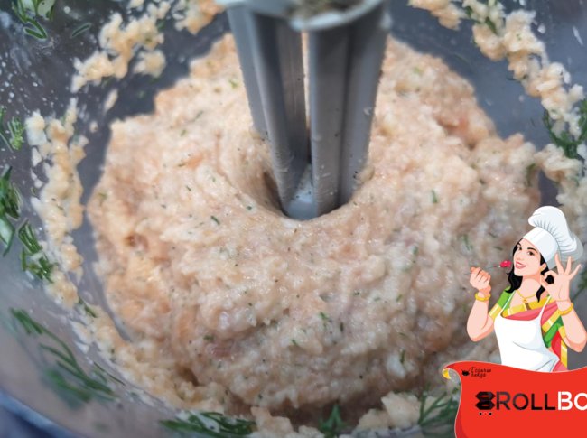 В измельчитель положила филе рыбы, яйцо, нарезанный репчатый лук, хлеб, предварительно замоченный в молоке, нарезанную зелень укропа. Сразу же посолила, поперчила. Все измельчила. Убрала в холодильник на полчаса.