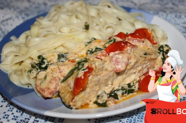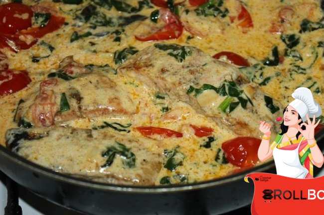 Лосось в сырно-сливочном соусе с помидорами черри и шпинатом - «Блюда из рыбы»