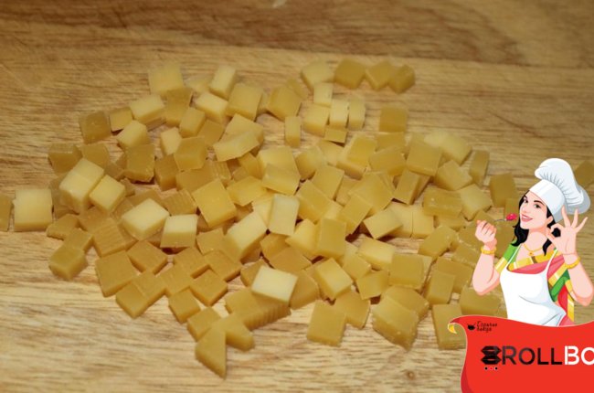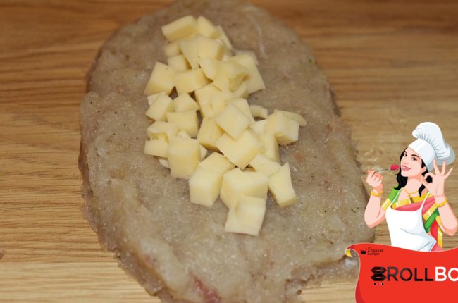 Из фарша сформовать лепёшку, посередине положить кубики сыра.