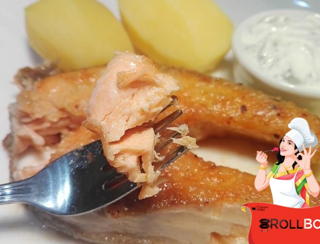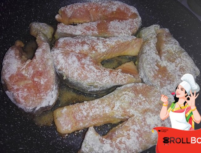 Стейки форели обваляла в этой муке с двух сторон. Не хотите использовать вегету, просто посолите рыбу, а потом обваляйте в муке.