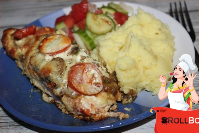 На оливковом масле обжарила лук( во время обжарки лук слегка посолила и добавила щепотку сахара),добавила грибочки и обжарила все вместе,еще чуть посолила ,добавила неполную чайную ложечку муки ,перемешала и обжарила еще пару минут.Затем выключила и оставила остывать.В остывшие грибы дробавила порезанный укроп(немножко) и перемешала.В кружку положила пару ложек сметаны,добавила немножко кипятка и быстро перемешала( это для того,чтобы при запекании сметана не свернулась).Добавила ложечку майонеза,попробовала на вкус,добавила чуть-чуть соли ,перчика и щепотку сахара так,чтобы соус был вкусный.Добавила небольшую горстрочку тертого сыра и перемешала.В форму для запекания налила немножко оливкового масла,выложила рыбку,на нее слой грибочков,затем кружочки помидорок ,сверху полила сырно-сметанным соусом и поставила в разогретую духовку.запекала при 180 градусах до легкого зарумянивания.