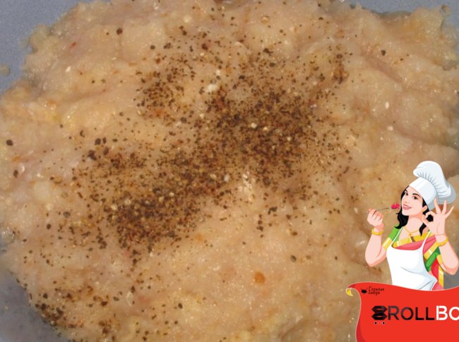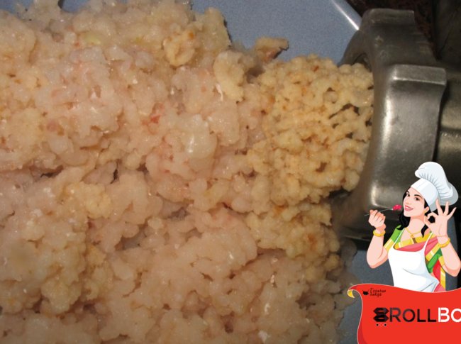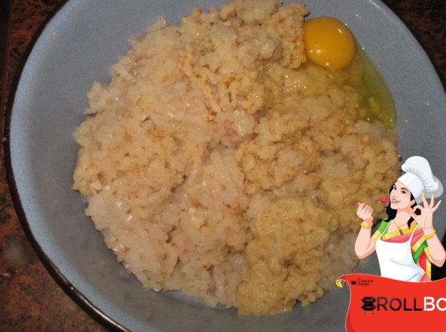 Рыбный фарш (у меня из трески) заправляем солью, перцем, размоченной булкой, луком и яйцами, выбиваем для уплотнения.