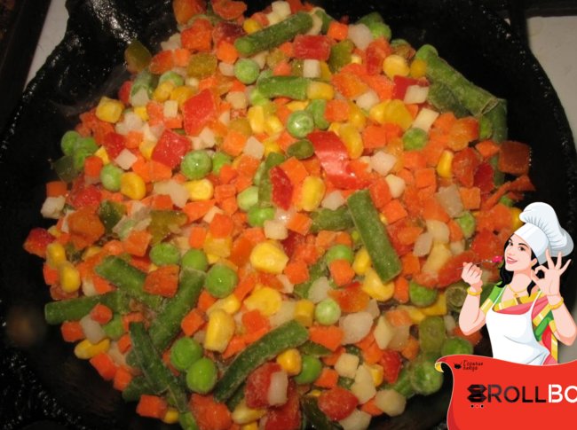 Жарим на растительном масле до мягкости замороженной овощной смеси (у меня морковь, горошек, кукуруза, лук, кольраби и сладкий перец) меньше, чем пятая часть объема фарша, подсаливаем смесь. Пусть остывает.